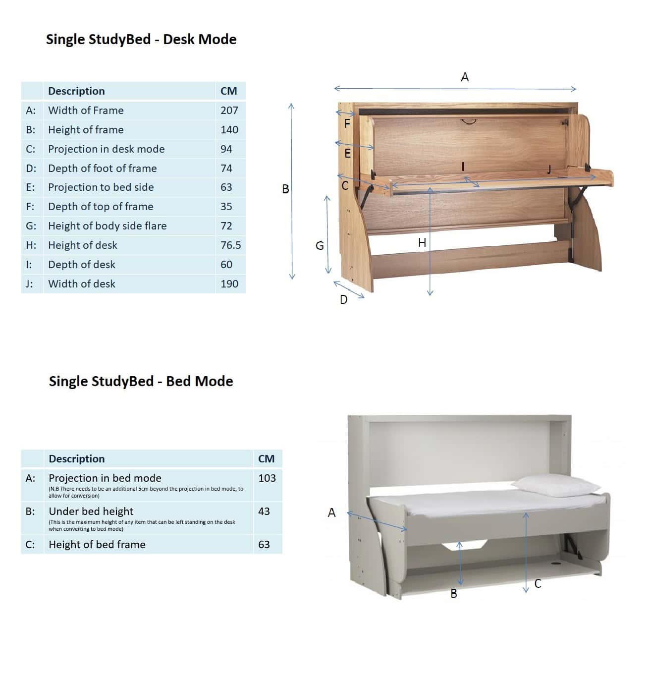 Multi-functional study beds with adjustable Desk Mode and Bed Mode options, featuring detailed dimensions in wood and white finishes for versatile student or space-saving furniture solutions.