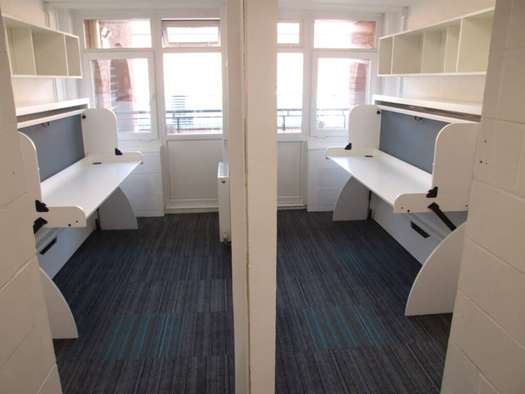 The halls consist of individual community units, each with 6 separate bedroom/study areas which are inevitably, somewhat spatially challenged. The before and after pictures show how effective the use of StudyBeds can be in very small rooms – the extra floor space generated makes a big difference.